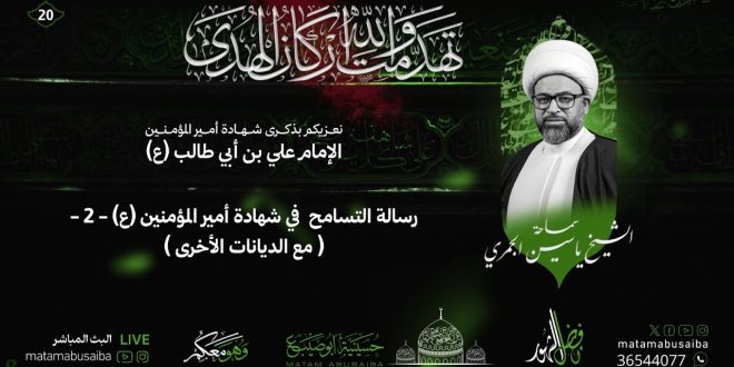 الشيخ ياسين الجمري | رسالة التسامح في شهادة أمير المؤمنين (ع) 2 | مع الديانات الأخرى | 20 رمضان 1446هـ 24 مارس، 2025 226 زيارة شاركها tweet 2025-03-24
